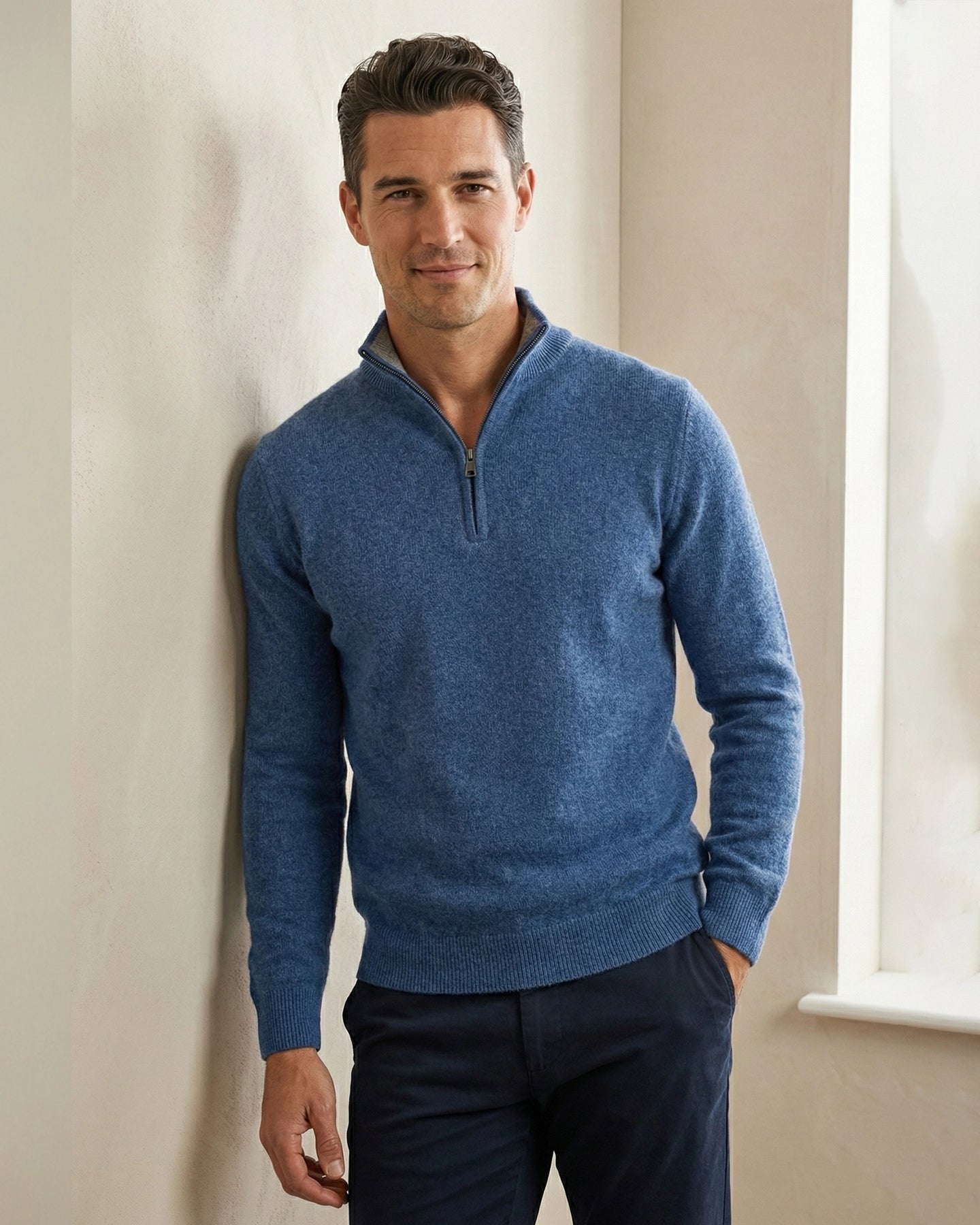 Design Details: A relaxed-fit polo sweater with a stylish collar and front zip fastening. Features long sleeves and ribbed trims for a polished look.