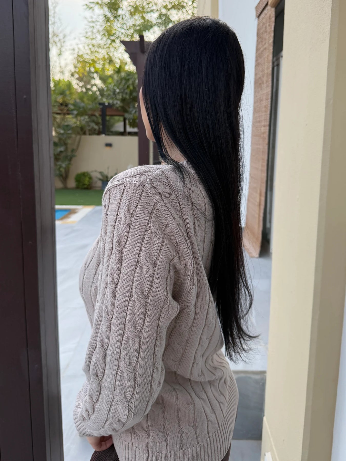 Design Details: A timeless winter essential reimagined with a modern touch. This round neck sweater features a delicate, classic cable knit texture with a clean silhouette and relaxed drape. Ribbed cuffs and hem add subtle structure while maintaining an effortlessly cozy feel. Thoughtfully cut for everyday layering, it flatters without clinging.