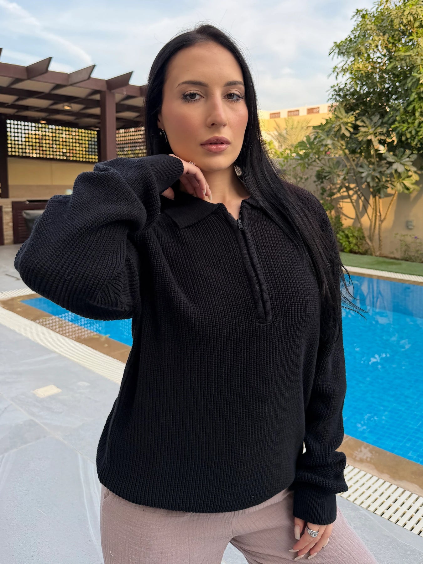 Design Details: A relaxed-fit Quarter Zip sweater with a stylish collar and front zip fastening. Features long sleeves and ribbed trims for a polished look.