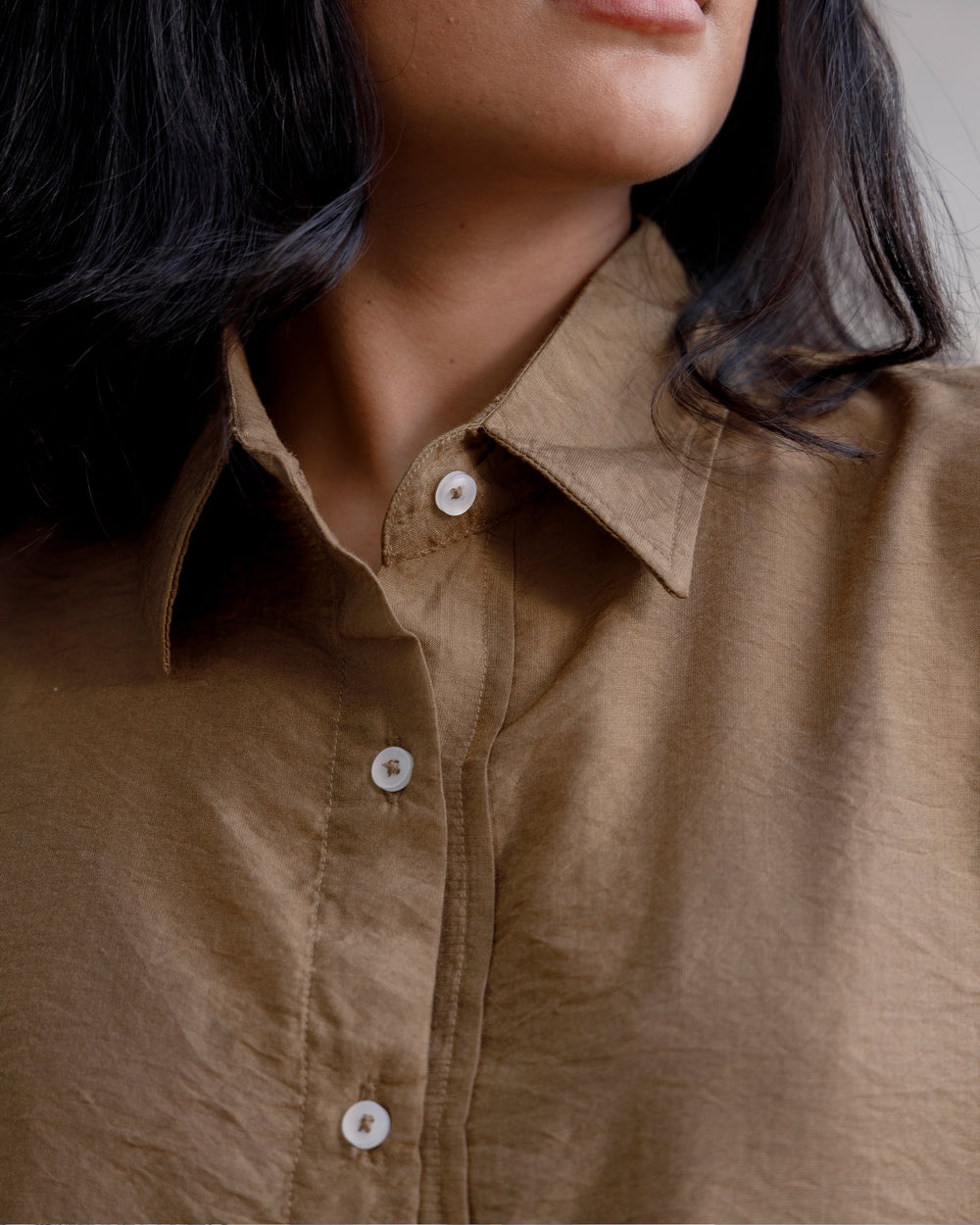 A relaxed-fit shirt in a warm sandstone shade, tailored from lightweight textured fabric with a soft matte finish. Designed with a sharp pointed collar, full button placket, and long sleeves with structured cuffs. The curved hem adds fluidity, making it an easy-to-style piece for both refined workwear and casual off-duty looks.